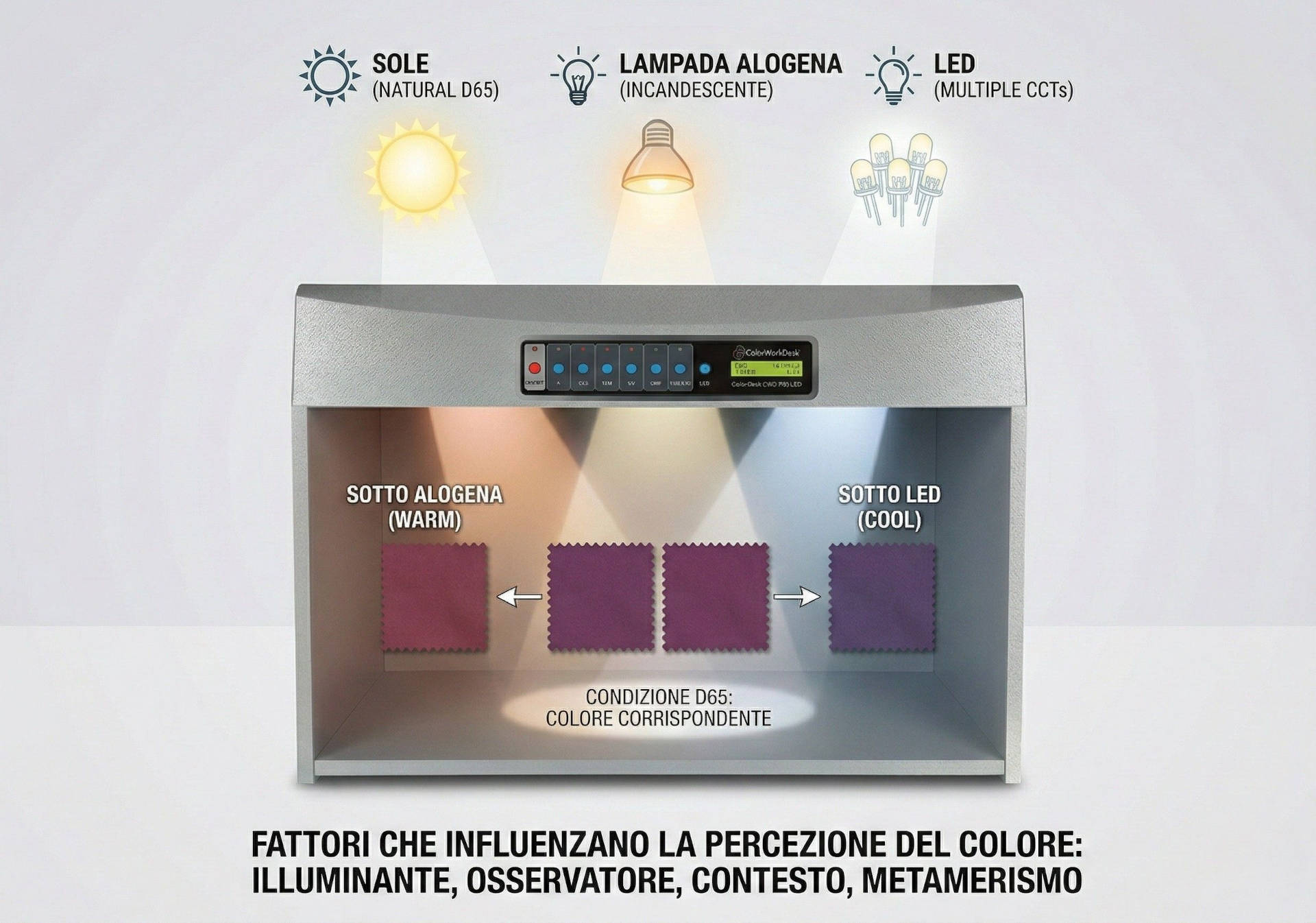 Questo fenomeno, particolarmente problematico nell’industria tessile, automobilistica e cosmetica, richiede valutazioni sotto illuminanti multipli per garantire l’accettabilità del prodotto in condizioni d’uso reali. Lo strumento che consente la corretta valutazione della metameria è la cabina luce.