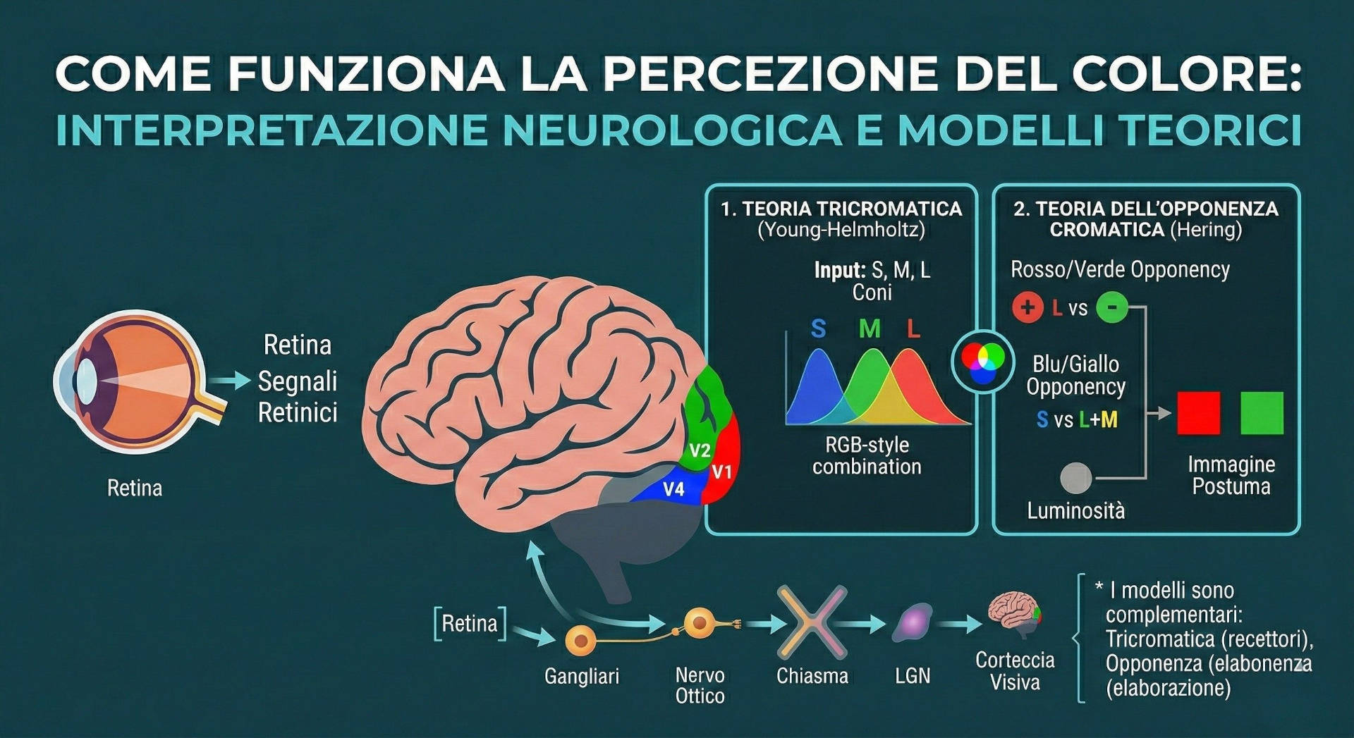- La teoria dell’opponenza cromatica, sviluppata da Hering, descrive come il sistema visivo elabori i segnali dei coni in tre canali opponenti: rosso-verde, blu-giallo e chiaro-scuro (luminosità). Questo modello spiega fenomeni percettivi come le immagini postume negative e l’impossibilità di percepire simultaneamente tonalità come “rosso-verdastro” o “blu-giallastro”. L’opponenza cromatica rappresenta una fase successiva dell’elaborazione neurale, che avviene già a livello retinico e viene ulteriormente sviluppata nella corteccia visiva.