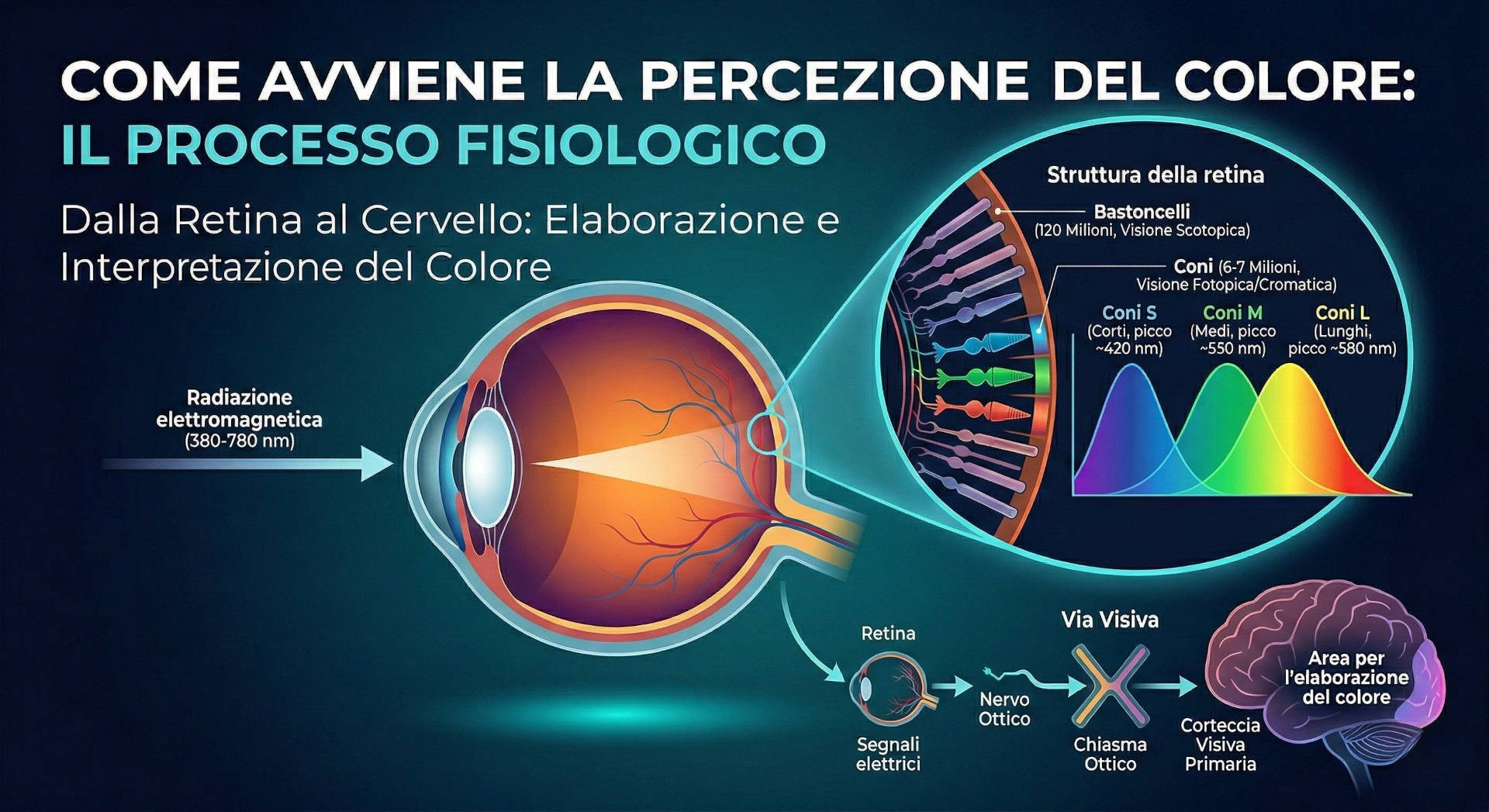 La percezione del colore nell’occhio umano inizia quando la radiazione elettromagnetica, nell’intervallo visibile compreso indicativamente tra 380 e 780 nanometri (400–700 nm in ambito colorimetrico industriale), penetra attraverso la cornea e raggiunge la retina.