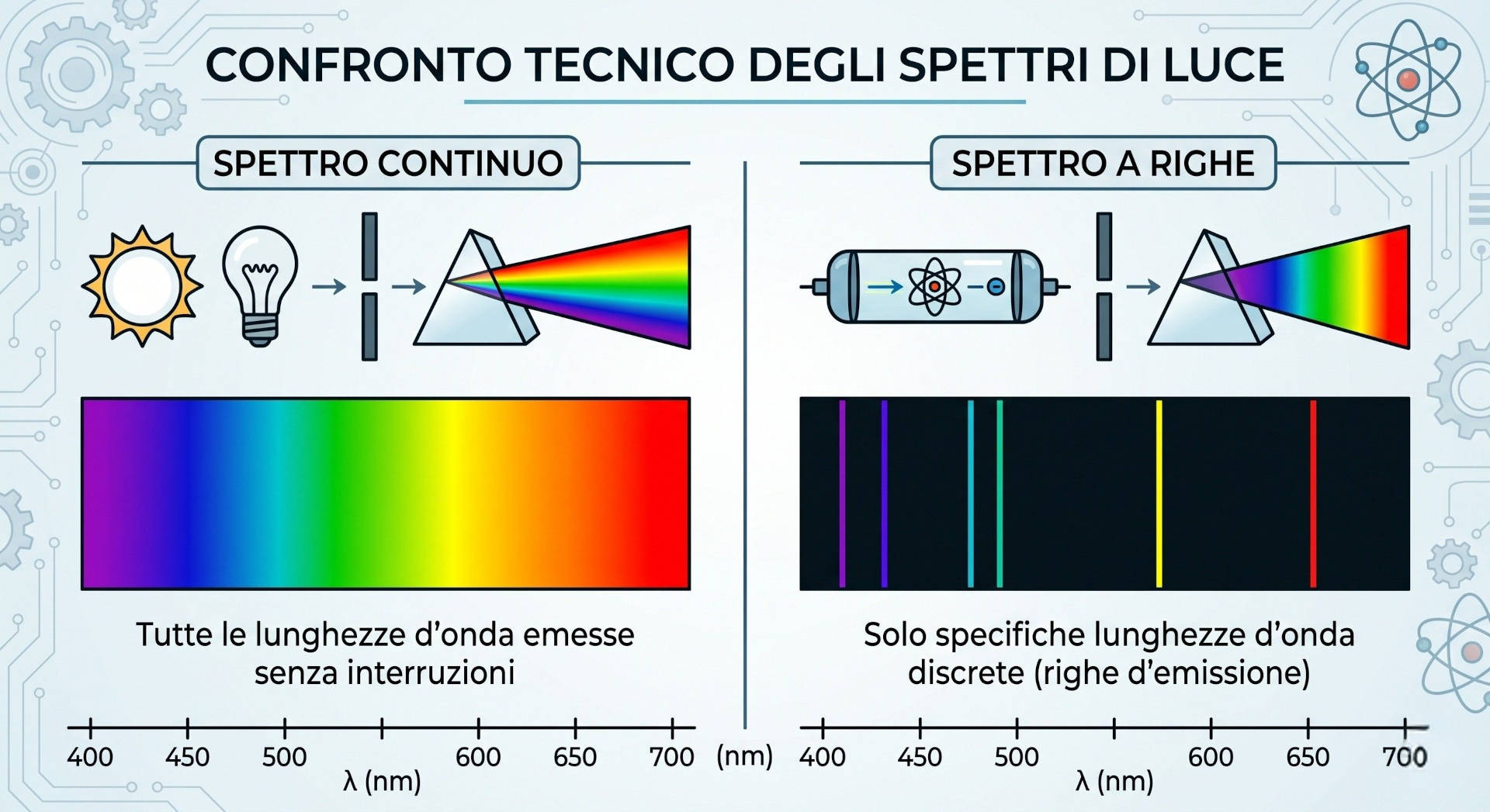 - Spettro continuo: tipico della luce solare e di molte sorgenti a incandescenza, in cui tutte le lunghezze d’onda sono presenti senza interruzioni. Produce il classico arcobaleno di colori sfumati l’uno nell’altro.