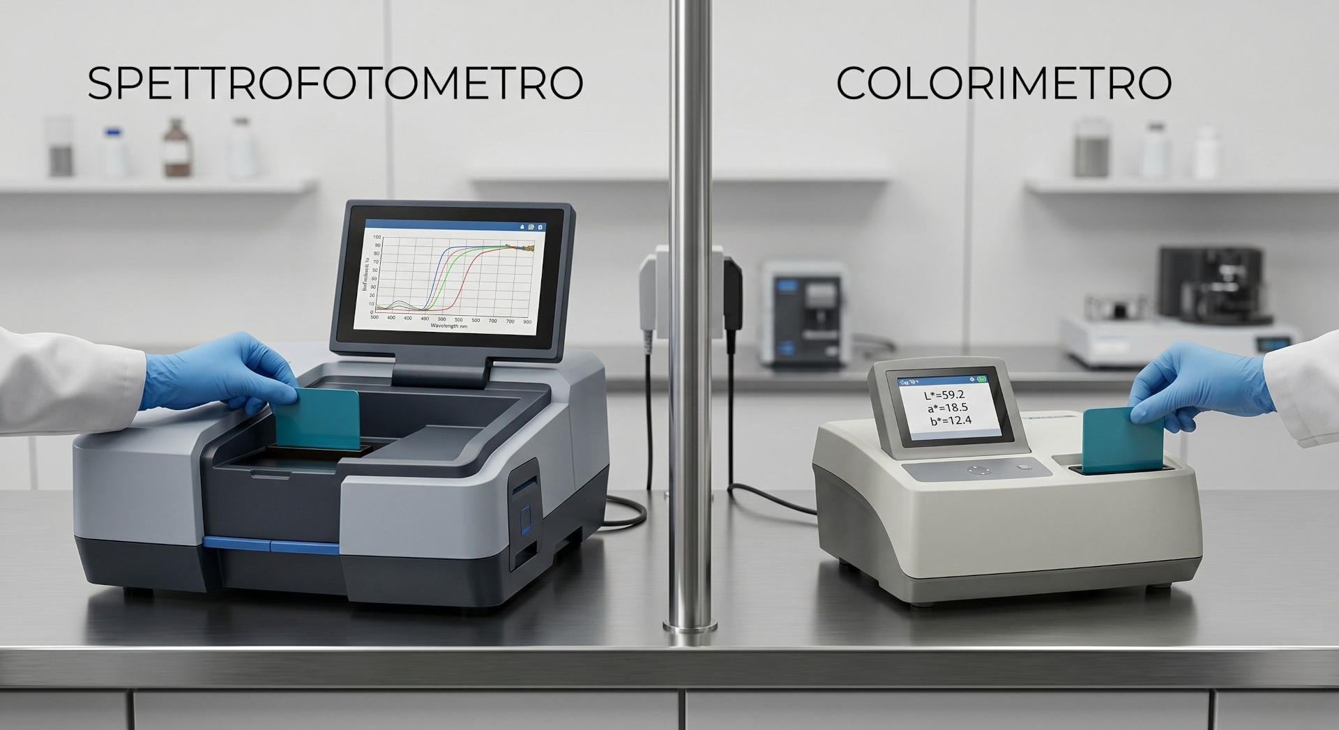 Lo spettrofotometro, invece, analizza il campione lunghezza d’onda per lunghezza d’onda sull’intero spettro visibile, fornendo la curva di riflettanza o trasmittanza completa.